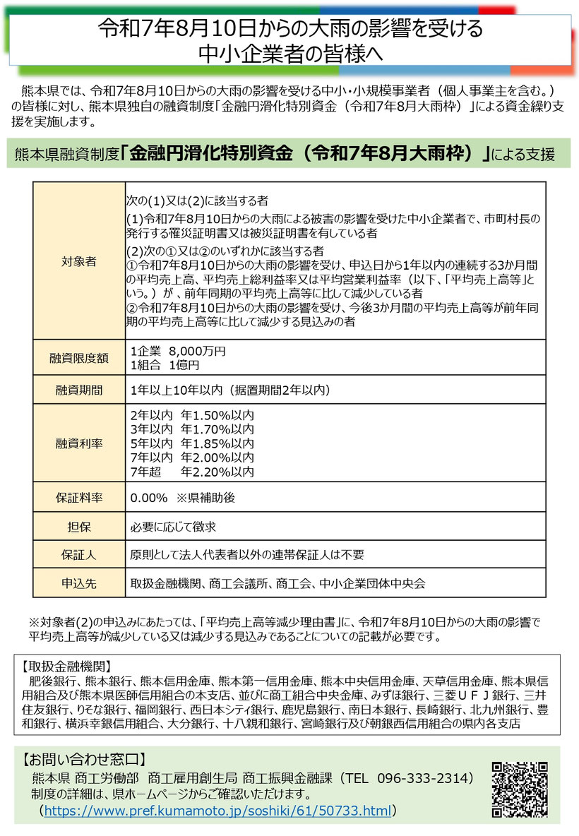 熊本県では、令和7年8月10日からの大雨の影響を受ける中小・小規模事業者(個人事業主を含む)の皆さまに対し、熊本県独自の融資制度による資金繰り支援が実施されています。
