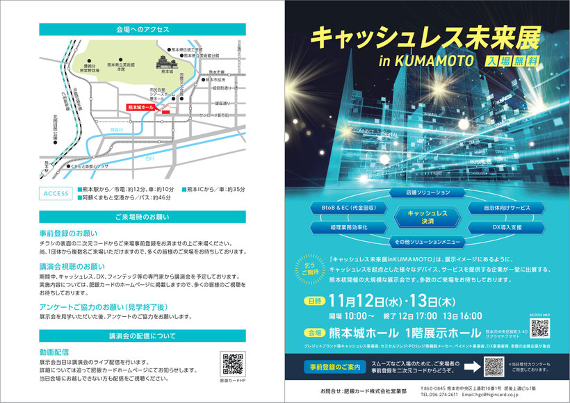 「キャッシュレス未来展 in KUMAMOTO」を、下記のとおり開催されます。 キャッシュレスをはじめとしたDX・フィンテック関連の最新ソリューションが一堂に集まり、自治体向けサービスや店舗向け機器展示、講演会の配信などが予定されています。 キャッシュレス社会の今とこれからについて理解を深めていただける時間となります!入場無料です。...