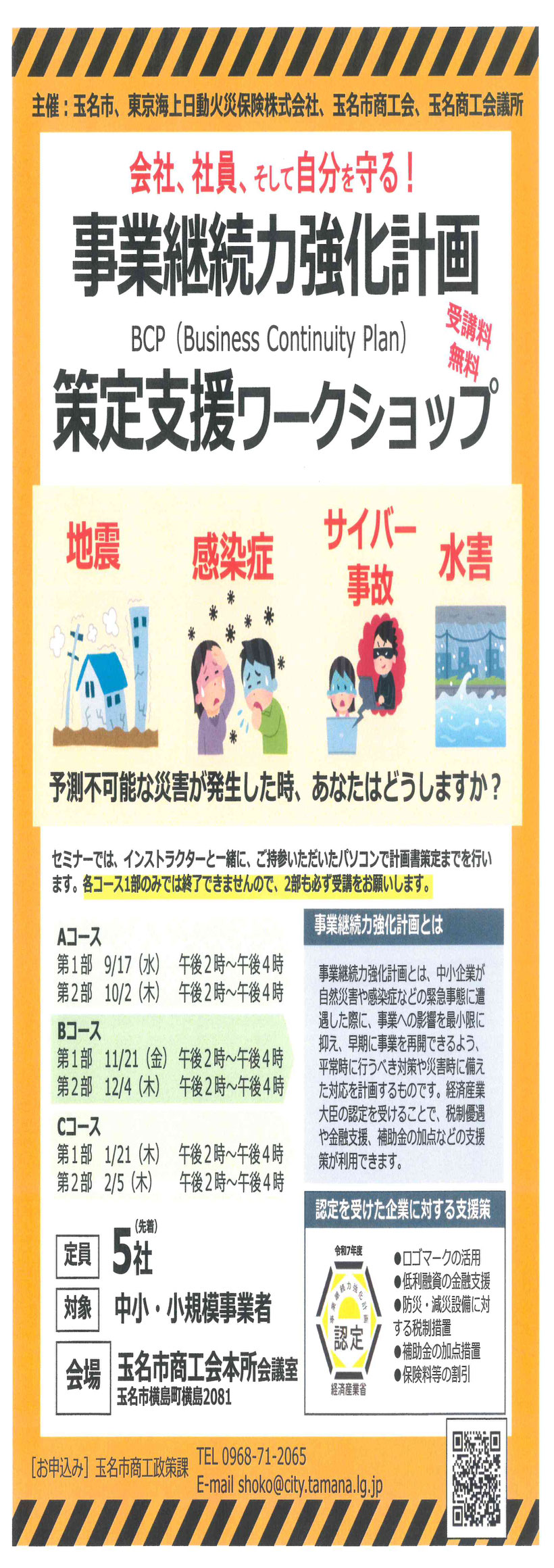 中小企業が自然災害や感染症などの緊急事態に遭遇した際に、事業への影響を最小限に抑え、早期に事業を再開できるよう、平常時に行うべき対策や災害時に備えた対応を計画するものです。